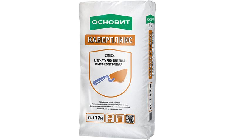 Штукатурно-клеевая смесь ОСНОВИТ КАВЕРПЛИКС ТС117 H высокопрочная предназначена для создание армированного базового штукатурного слоя СФТК в вандалостойкой зоне (1,5 м от уровня цоколя, а также армированного слоя повышенного качества с ударостойкойкостью не менее 8 Дж.